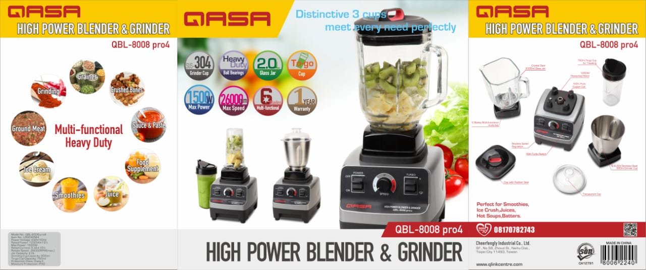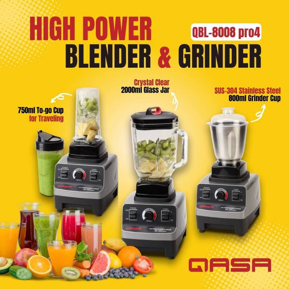 The QASA QBL-8008 pro4 is a versatile high-performance blender and grinder designed to meet the modern kitchen’s demands. Whether you’re blending smoothies, crushing ice, making soups, or grinding dry ingredients, this powerhouse delivers efficiency and consistency. Equipped with a 1500W max power motor and multiple blending cups—including a durable stainless steel grinder, a 2.0L glass jar, and a to-go cup—this appliance guarantees superior results across a variety of tasks. Built with heavy-duty components and smart speed control, the QBL-8008 pro4 makes food prep easier, faster, and more enjoyable.